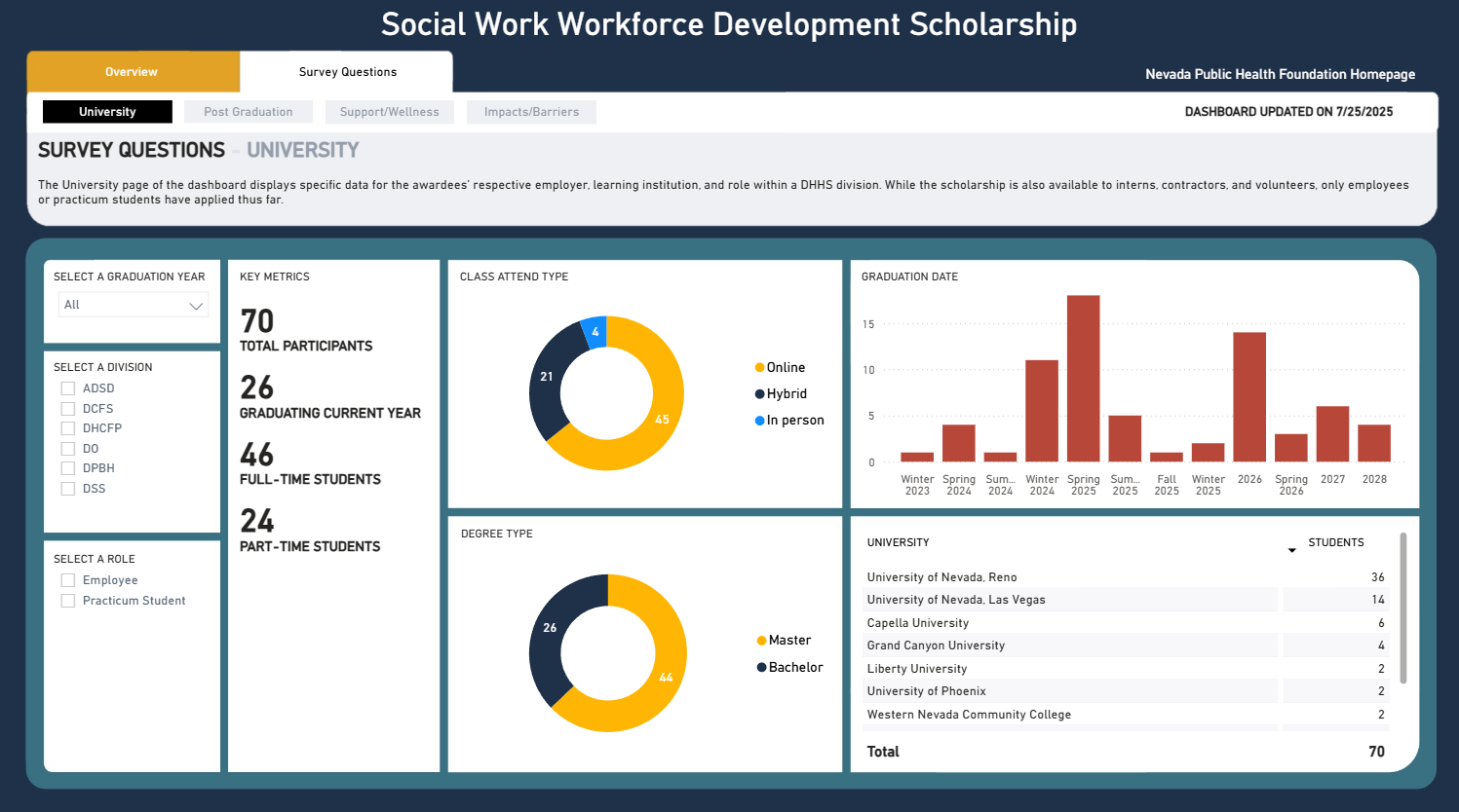 The SWWD Scholarship dashboard provides an overview of awardee demographics and characteristics within the Department of Human Services (DHS). It tracks how scholarship funds are applied to education expenses and highlights outcomes such as workforce development, employee morale, and support for nontraditional students